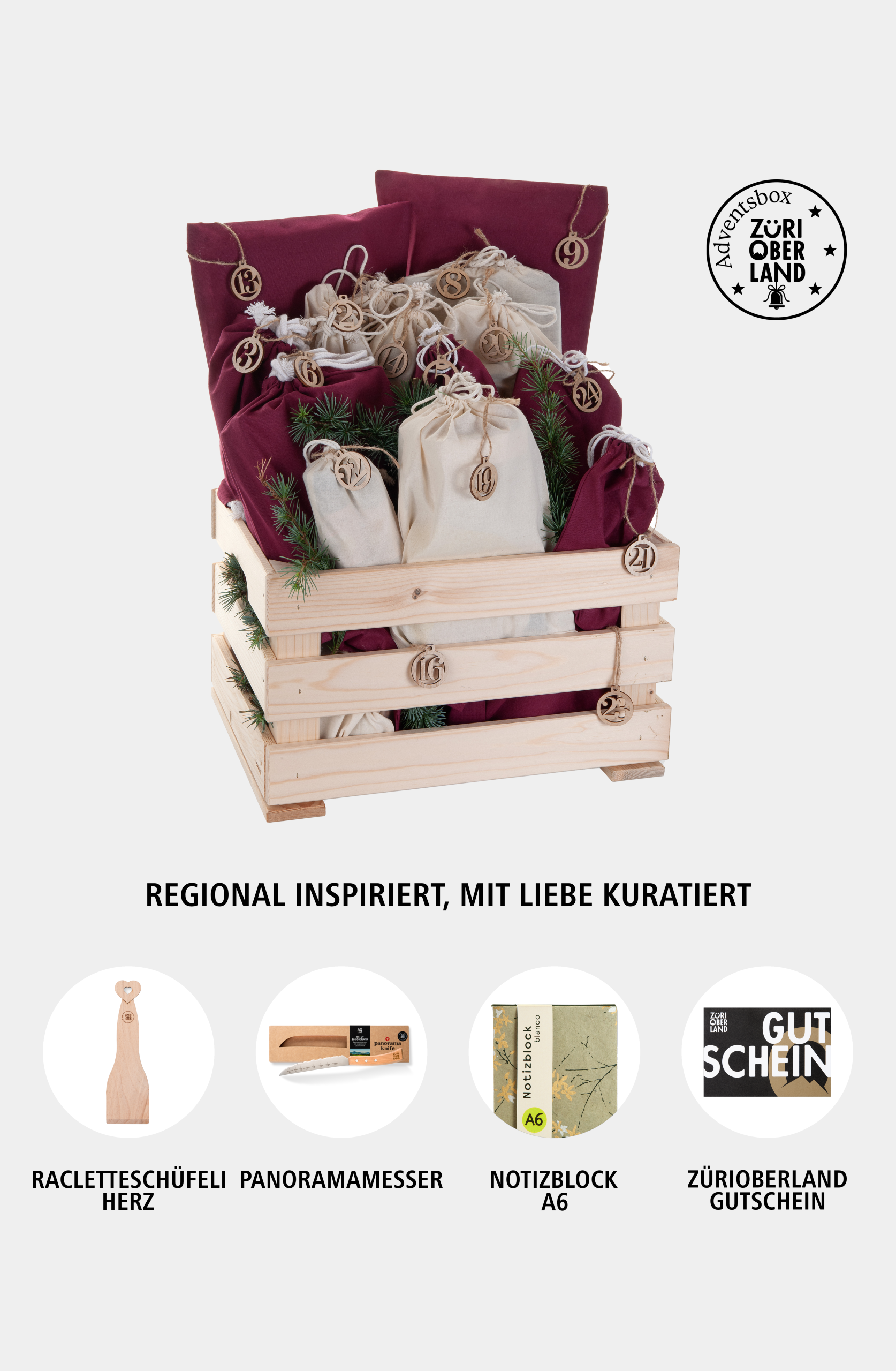 Ein Zusammenspiel von 15 regionalen Produkten aus 10 verschiedenen Betrieben. Diese echten Regionalprodukte versprechen einerseits regionale Rohstoffe, andererseits Verarbeitung in der Region. Damit schaffen sie Arbeits- und Ausbildungsplätze im Zürcher Oberland. Ein liebevoll zusammengestellter Adventskalender, der Herz und Sinn begeistert.